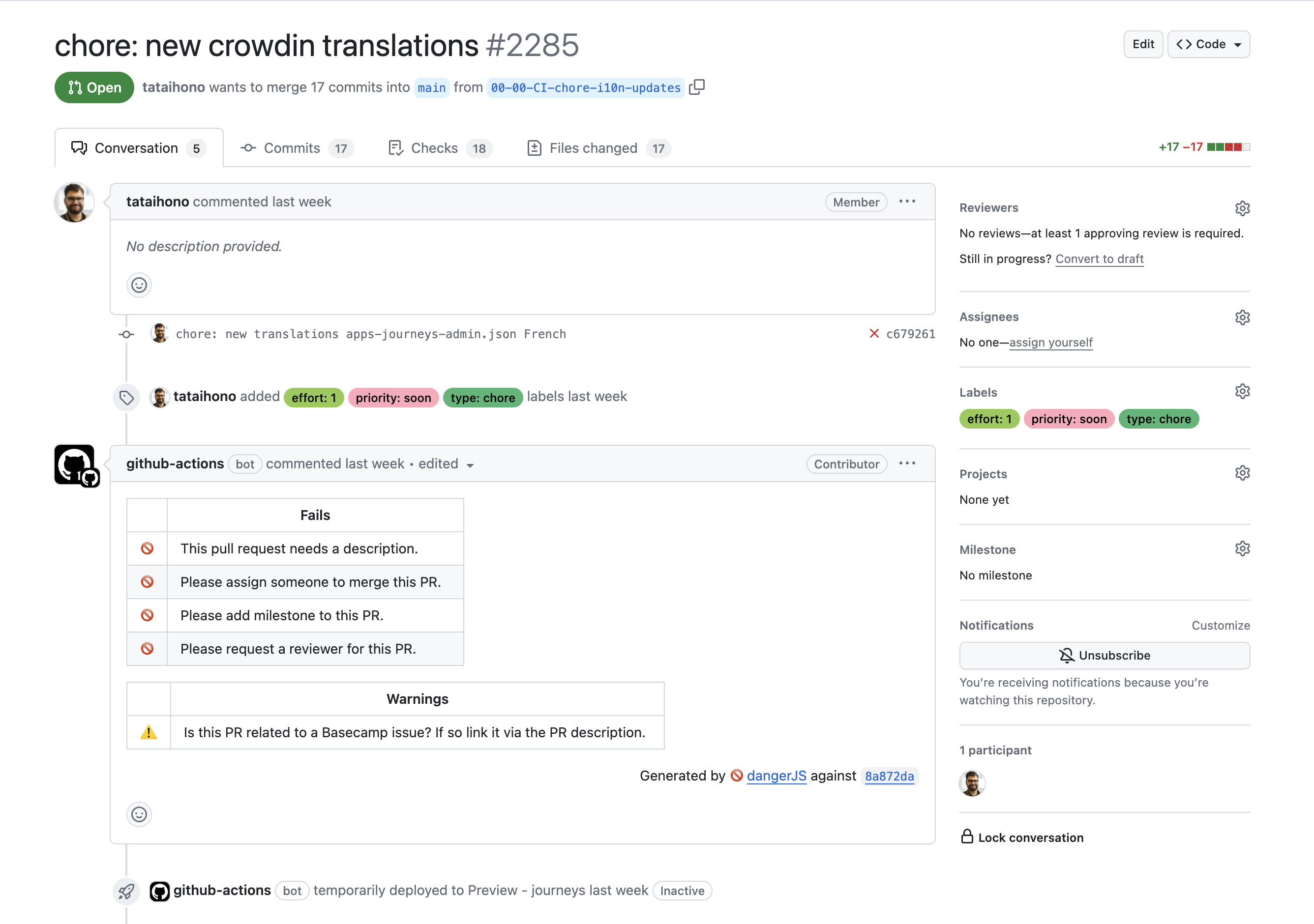 Important: Crowdin will create and push Pull Requests with translations automatically, regardless of whether the translation team has reviewed them. This ensures continuous deployment but means that manual review of translations should be done post-deployment if needed.
